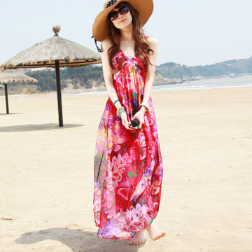 夏季海邊度假沙灘裙 波西米亞印花露背性感真絲連衣裙 吊帶長(zhǎng)裙 /