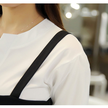 女裝春裝2016新款潮假兩件套大碼長袖女士韓版修身雪紡紗泡泡袖夏 /