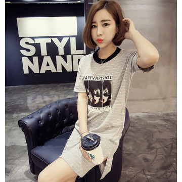 2016夏季新款韓版中長款條紋打底裙寬松連衣裙條紋t恤女短袖開叉 /