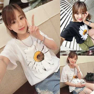 最新韓版女式短袖T恤夏裝上衣打底衫向日葵圖案印花加大碼學(xué)生裝 /