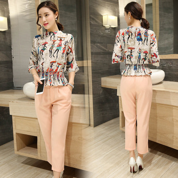 實拍2016新款春季套裝韓版修身顯瘦印花體恤九分褲休閑套裝 /