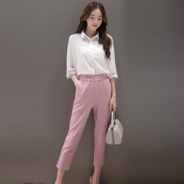 實拍2016夏季新款蝴蝶結(jié)蝙蝠5分袖襯衣+修身個性蘿卜褲套裝 /