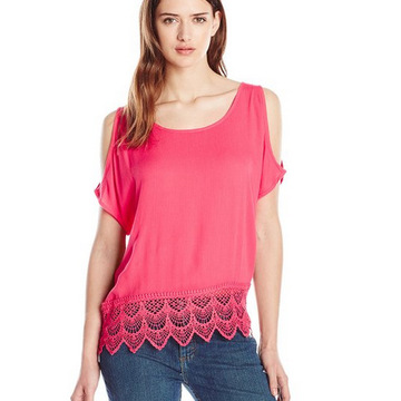 速賣通2016夏季新款蕾絲拼接露肩圓領(lǐng)短袖雪紡衫 /