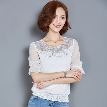 2016夏裝新款韓版燙鉆花邊雪紡衫打底小衫 /