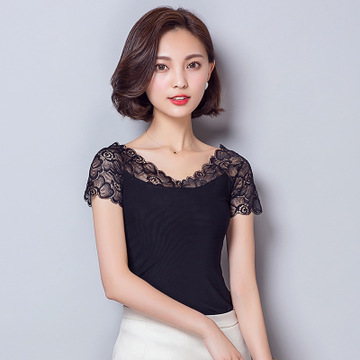 2016夏裝新款蕾絲拼接V領(lǐng)短袖打底上衣t恤大碼體恤 /