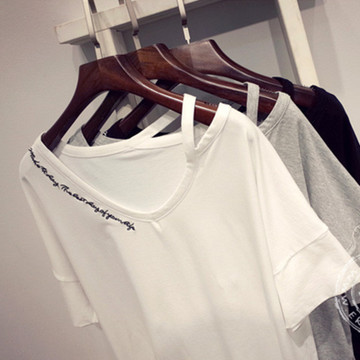 實拍夏季新款韓版學生字母刺繡露肩寬松短袖T恤女前短后長上衣 /