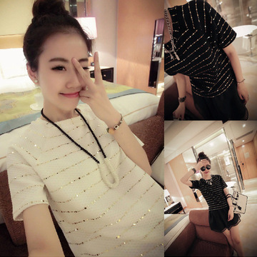 春夏新款女T簡約亮片條紋插肩袖寬松港味T恤 /