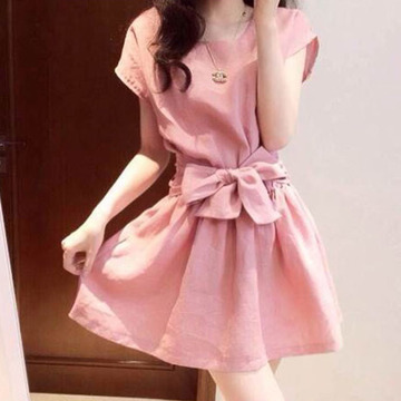 8302#現(xiàn)貨夏裝新款韓版大碼棉麻女裝連衣裙甜美蝴蝶結(jié)修身顯瘦裙 /