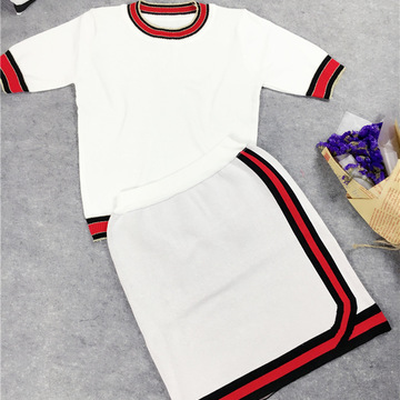 歐洲站新款女裝時(shí)尚潮小香風(fēng)拼色條紋上衣+半身裙針織套裝 /