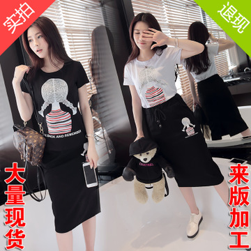 歐洲站2016小女孩圖案短袖套頭純棉T恤半身裙兩件套套裙 /