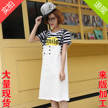 夏裝新款休閑學(xué)院風(fēng)笑臉條紋兩件套背帶連衣裙女潮 /