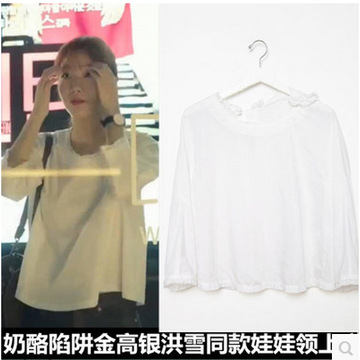 奶酪陷阱金高銀洪雪同款 韓版白色純棉花邊娃娃領寬松上衣T恤 /
