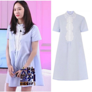 大牌駕到fx鄭秀晶微博同款藍色短袖連衣裙子蕾絲鉤花襯衫 /