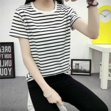 實(shí)拍韓版大碼打底衫女夏天胖mm寬松休閑條紋短袖t恤女半袖 /