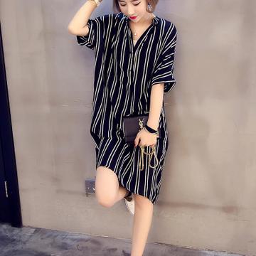 2016夏裝新款 韓版豎條紋中長(zhǎng)款襯衫單排扣短袖長(zhǎng)襯衣女潮 /