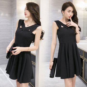實(shí)拍2016新款夏季歐美黑色顯瘦露背吊帶交叉小黑裙優(yōu)雅連衣裙女 /