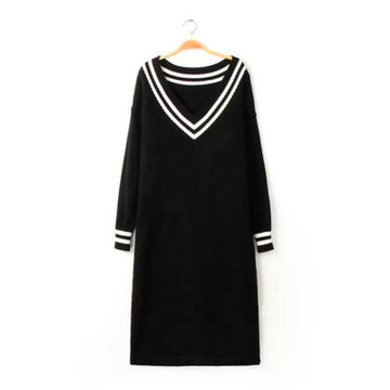 歐美海軍風(fēng) 深V領(lǐng)加長(zhǎng)款側(cè)開(kāi)叉針織衫連衣裙 寬松大碼修身毛衣潮 /