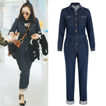 2016夏裝明星楊冪機(jī)場(chǎng)同款BF牛仔連體褲女長(zhǎng)袖寬松連衣褲工裝褲 /