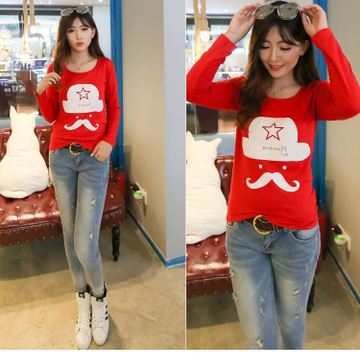 • 2015秋冬季新款長袖修身顯瘦打底衫女款純棉印花圓領(lǐng)t恤女H /