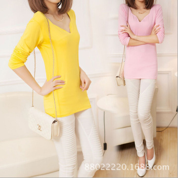 • 2015秋冬季新款長袖修身顯瘦打底衫女款純棉印花V領(lǐng)t恤女H45 /