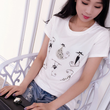 小谷粒春裝新款2016韓版修身 卡通短袖T恤女釘珠圓領(lǐng)印花上 /