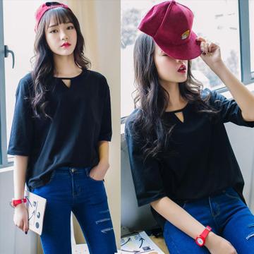 百搭小清新 韓三角形鏤空簡約純色棉質(zhì)短袖T恤 /