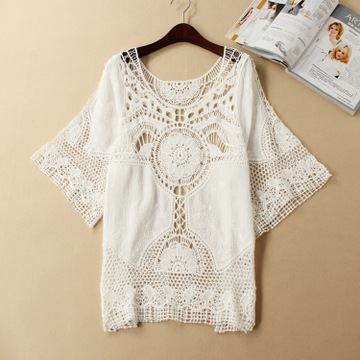 棉麻刺繡純棉線鉤花拼接七分袖外搭套頭衫女 夏寬松縷空蕾絲罩衫 /