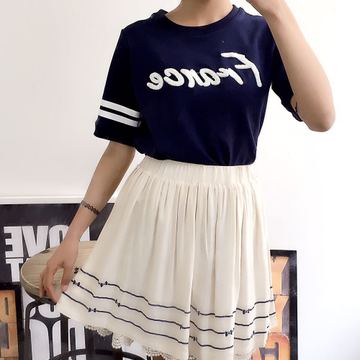 新款棉麻蕾絲花邊拼接半身裙女 春夏百搭松緊腰印花傘裙 清新短裙 /