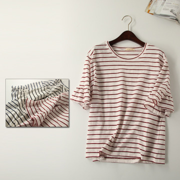 夏款純棉竹節(jié)棉五分喇叭袖袖條紋T恤衫女 圓領(lǐng)寬松套頭衫百搭小衫 /
