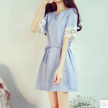 2016夏季韓版日系小清新蕾絲拼接A字?jǐn)[格紋甜美文藝連衣裙女 /