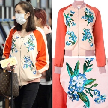 楊冪機(jī)場明星同款2016春季刺繡花朵棒球服短外套女橘色飛行員夾克 /
