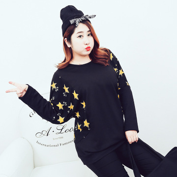 胖妹妹春季新款女裝拼接印花面料長袖蝙蝠衫 胖mm服裝T恤批發(fā)128 /