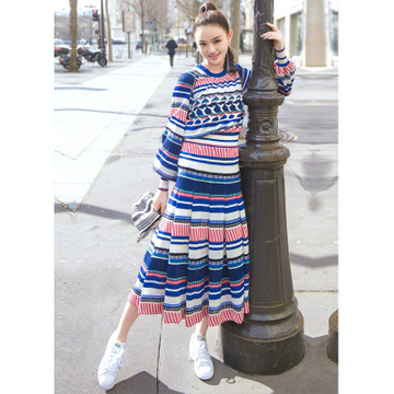 林允明星同款 歐美走秀 優(yōu)雅拼色幾何印花修身燈籠袖針織連衣裙女 /