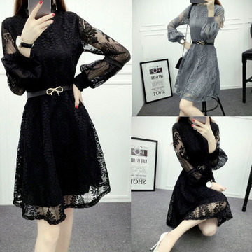 2016春夏時尚新款蕾絲連衣裙中長款氣質(zhì)鏤空燈籠袖韓版修身大擺裙 /