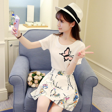 2016春夏套裝裙甜美修身兩件套蝴蝶印花短裙雪紡連衣裙 /