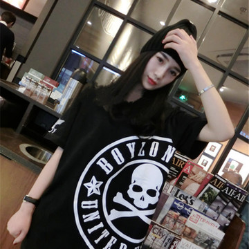 潮牌夏新款BOY字母骷髏頭短袖T恤女中長(zhǎng)款寬松顯瘦 /