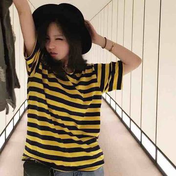 周揚(yáng)青同款黃黑條紋純棉女短袖百搭黃黑色小蜜蜂T恤 /