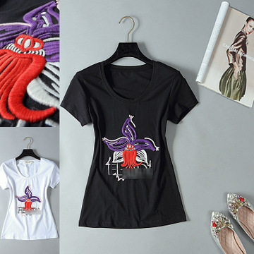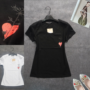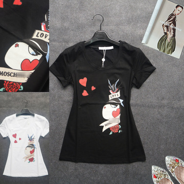 夏季新款歐美T時(shí)尚 手工鑲鉆釘珠印花修身彈力透氣 短袖純棉T恤女 /