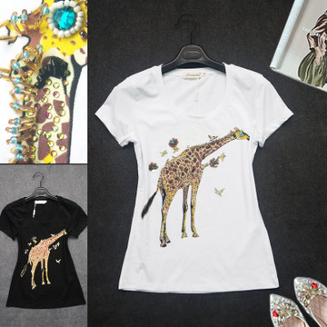 新品女裝T恤 時(shí)尚修身彈力百搭釘珠鑲鉆亮片長頸鹿印花圓領(lǐng)上衣 /