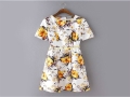 2016春夏新款高腰A字擺花朵圖案印花圓領(lǐng)短袖連衣裙女含腰帶 /
