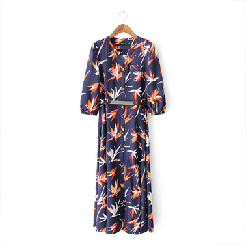 2016春夏新款高品質(zhì)印花底擺開叉修身款高腰顯瘦V領(lǐng)連衣裙長裙女 /