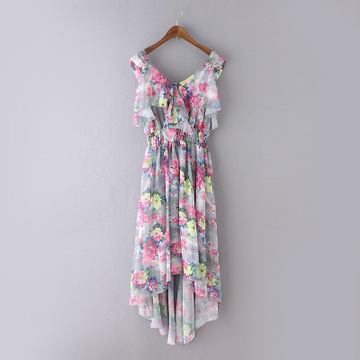 2016春夏新款波西米亞風(fēng)中長款顯瘦花朵印花燕尾下擺雪紡連衣裙女 /