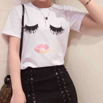 2016歐洲站紅人新款 濃密眼睛睫毛歪歪紅嘴唇印花寬松休閑短袖T /