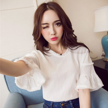 H夏裝新款甜美女生純色圓領(lǐng)短袖雪紡衫女 喇叭袖 /