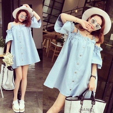 2016夏裝新款韓國時尚露肩排口設(shè)計牛仔連衣裙 /
