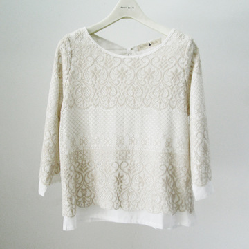 永信女裝日本原單女圓領(lǐng)長袖T恤蕾絲雪紡打底小衫純白色春款外貿(mào)出口尾貨 /