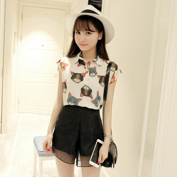 名雅軒女裝實(shí)拍套裝 時(shí)尚貓咪泡泡紗雪紡衫+歐根紗短褲兩件套女 /