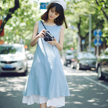 米尚潮流女裝無袖連衣裙夏森女連衣裙女長(zhǎng)款棉麻裙寬松系帶裙 /