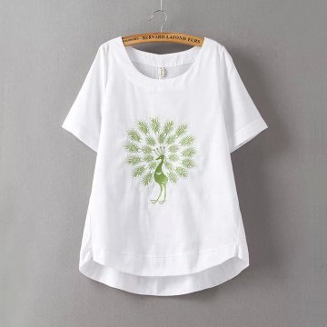米尚潮流女裝森女民族風(fēng)寬松棉麻繡花孔雀開屏短袖T恤夏裝顯瘦上衣女學(xué)生 /
