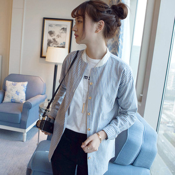米尚潮流女裝2016新款襯衫韓版春裝長(zhǎng)袖中長(zhǎng)款純棉條紋學(xué)生學(xué)院風(fēng)修身女襯衣 /